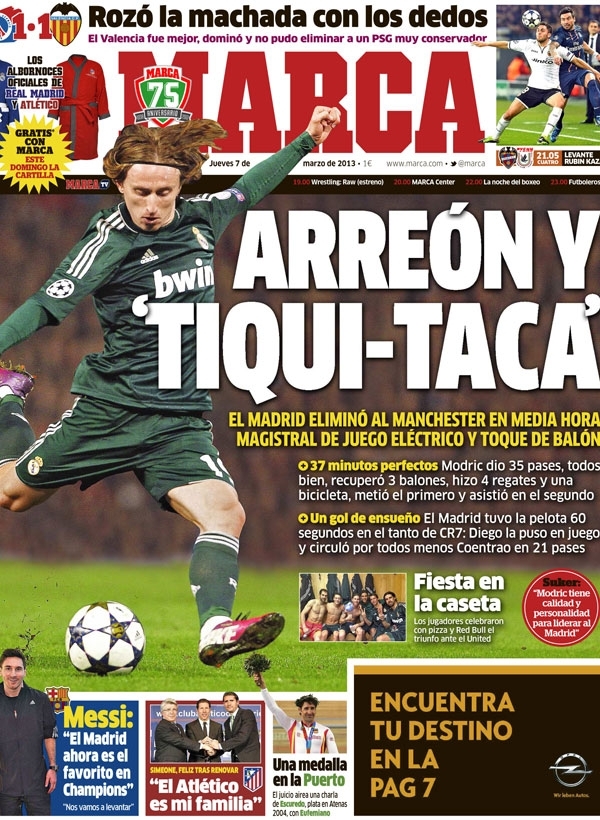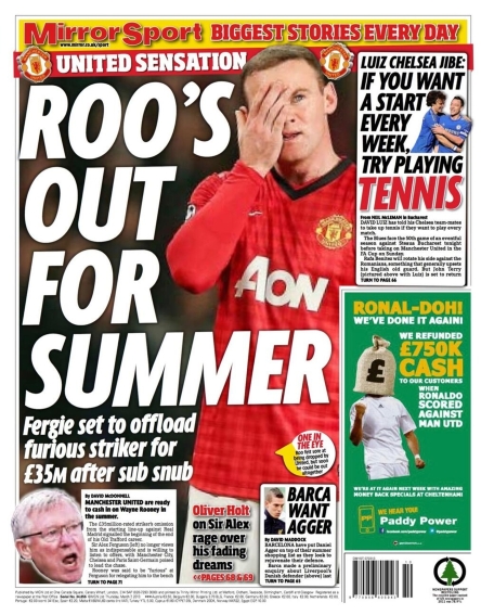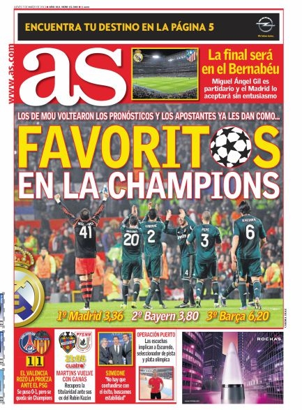 Allargando lo sguardo all’estero vediamo che i giornali spagnoli si dividono tra le promesse di Messi che vuol battere il Milan e l’impresa del Real Madrid che ora viene dato favorito nella lotta alla Champions. In Francia si esalta il PSG che ha eliminato il Valencia, ma la bomba di giornata la lancia il Mirror che lascia trapelare che dietro l’esclusione di Rooney dalla super sfida di martedì scorso c’è una possibile cessione in vista. Staremo a vedere, intanto leggiamo le prime pagine di oggi.