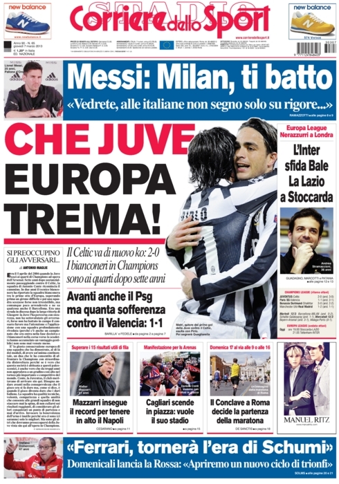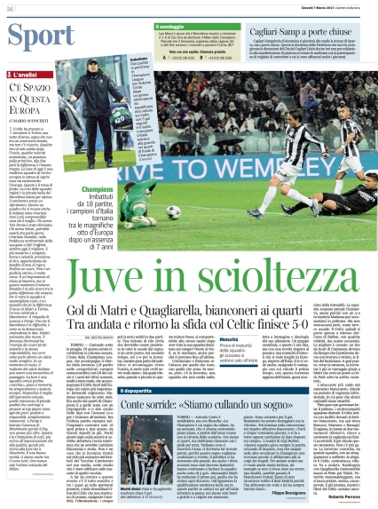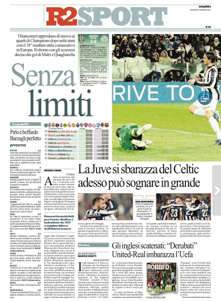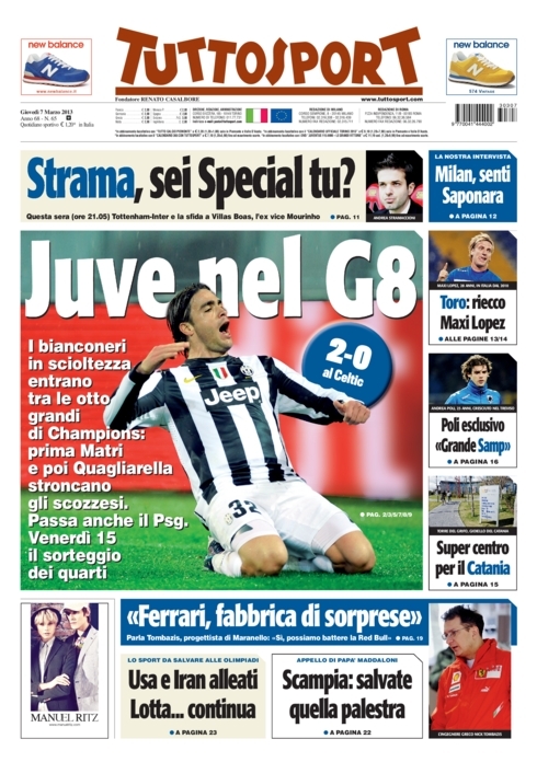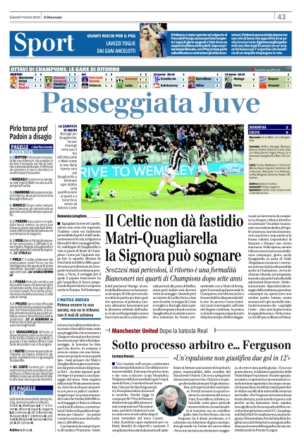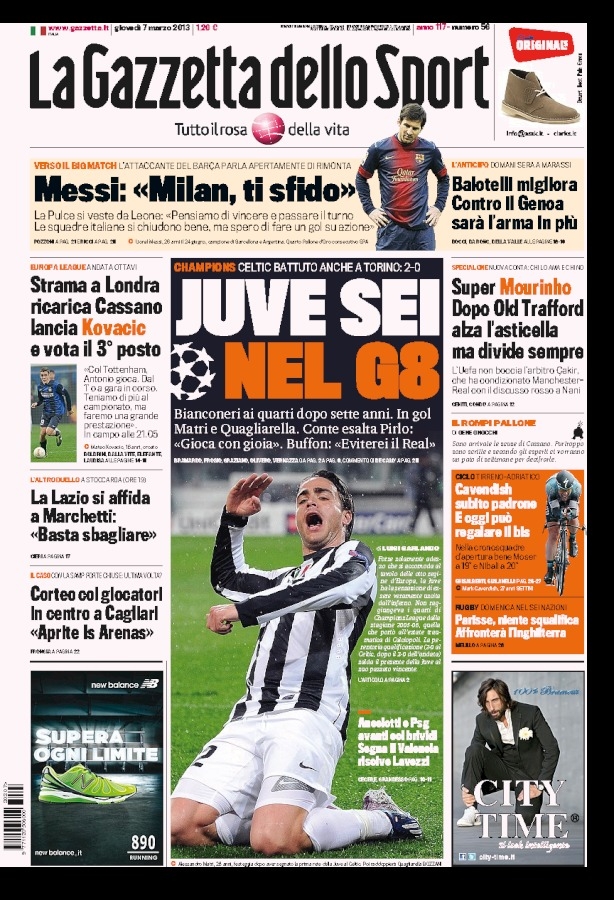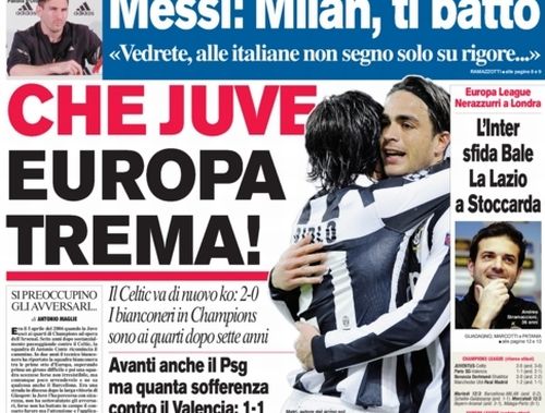 La passeggiata della Juventus di ieri in Champions League porta i giornali odierni ad osannare la squadra di Conte. C’è chi decanta la coppia d’attacco, chi la solidità dell’intera squadra. Tutte cose reali, anche se bisogna ammettere che il Celtic di ieri era davvero poca cosa. La Juve è nel G8, e tutti ora guardano al futuro e a dove può arrivare questa squadra. Ma non dimentichiamoci che oggi è anche la giornata dell’Europa League, e quindi anche di Lazio e Inter, ognuna con i propri problemi e con un avversario ostico davanti.