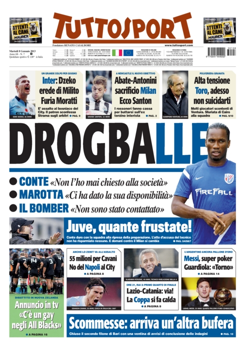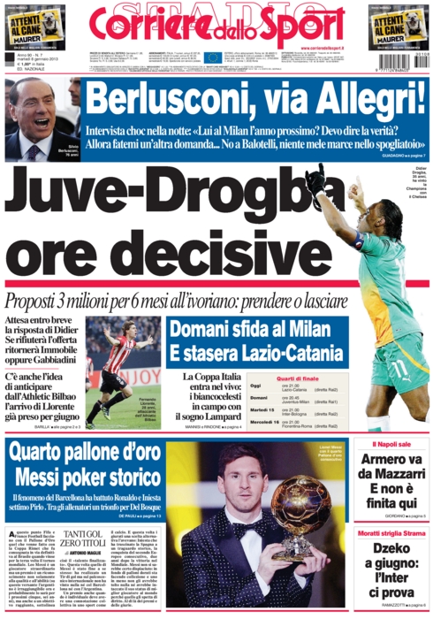 C’è qualcosa di più importante oggi, ed è l’affare-Drogba. La telenovela degli ultimi mesi potrebbe concludersi oggi, dato che secondo il Corriere dello Sport la Juve avrebbe presentato un’offerta ben al di sotto delle aspettative dell’ivoriano: 3 milioni per 6 mesi e basta. L’accetterà? Una cosa è certa, dopo oggi sapremo se Drogba andrà alla Juve oppure no.