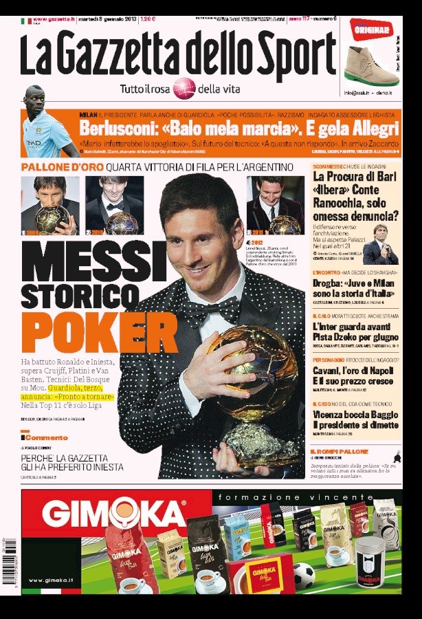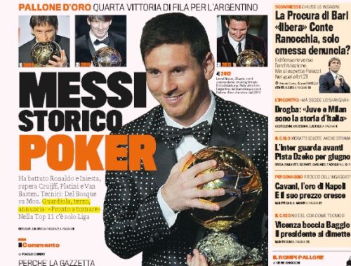 I quotidiani sportivi non potevano non aprire oggi con la notizia del giorno, e cioè il quarto Pallone d’Oro consecutivo a Leo Messi. Lo abbiamo già incensato a sufficienza nel post di ieri sera, appena arrivata la notizia, ma stranamente i giornali italiani danno la notizia solo di striscio. A parte la Gazzetta che mette Leo a tutta pagina, per il resto la notizia viene piuttosto snobbata, relegata in qualche trafiletto.