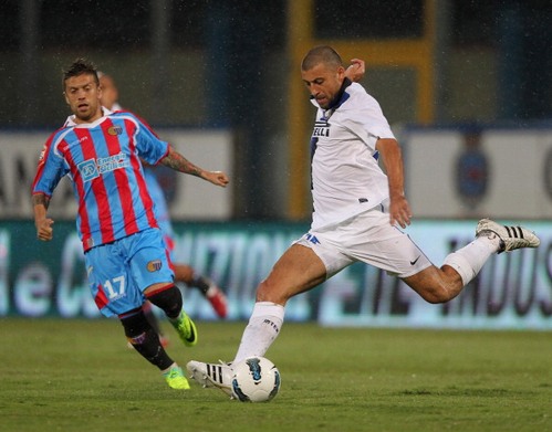 Gli ospiti passavano in vantaggio al minuto numero 6 della prima frazione di gioco, grazie ad Esteban Cambiasso, che infilava Andujar su assist di Maicon. Il Catania rispondeva ad inizio ripresa, prima pareggiando i conti con Almiron, poi passando in vantaggio con un rigore trasformato da Lodi.