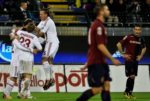 Ma i padroni di casa non si davano per vinti e cercavano la rete del pareggio, mentre il Milan giocava sul velluto, nella speranza di siglare la rete che avrebbe chiuso il match. Nella ripresa Ibarbo e Ribeiro cercavano di regalare una gioia ai tifosi del Sant’Elia, ma anche i rossoneri si mostravano propositivi, non riuscendo però a scardinare il fortino sardo.