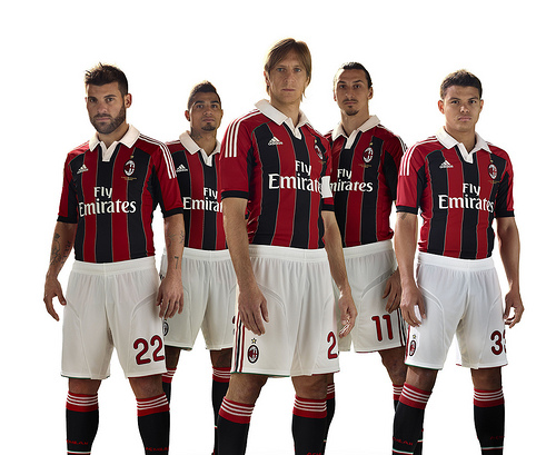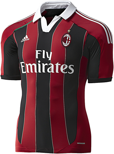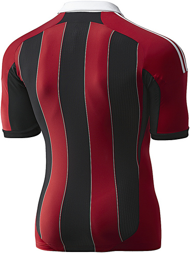 CARATTERISTICHE ESTETICHE – La maglia della stagione 2012/2013 avrà strisce ancora più larghe di quelle di quest’anno, per un totale di 5 (tre nere e due rosse), con il collo a polo che riporta sul retro la scritta A.C. Milan. Confermate invece le tre strisce bianche sulle spalle che simboleggiano il marchio dello sponsor tecnico, e cioè l’Adidas.
