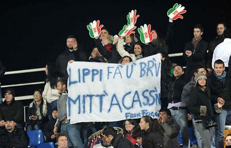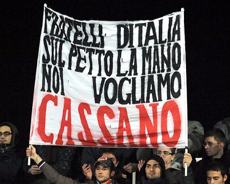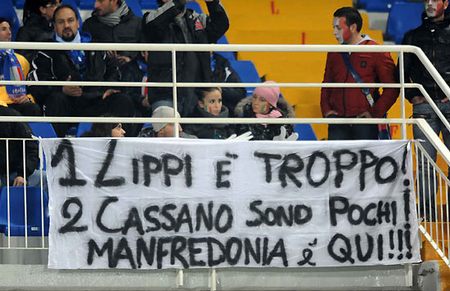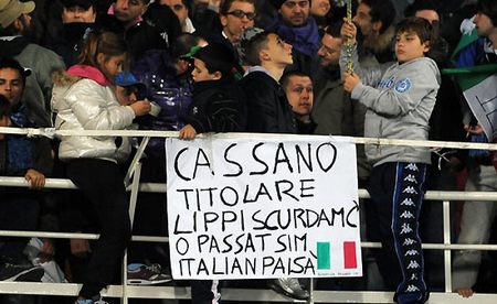 E non è stata certo l’unica manifestazione d’affetto nei confronti di Fantantonio, visto che, a dispetto di quanto affermavano Civoli e Bagni in telecronaca diretta, sono apparsi diversi striscioni che invitavano il ct viareggino a tornare sulle proprie decisioni, per far contenta la gran parte dei tifosi che vorrebbe il sampdoriano in azzurro: “Fratelli d’Italia sul petto la mano, noi vogliamo Cassano”, “Lippi sei Pazzo-si se Cassa-no”, “L’unica riforma costituzionale: Cassano”. La serata tutto sommato non è stata rovinata da cori continui, ma mister Lippi non ha potuto non notare i tanti striscioni a favore del barese. A voi la gallery.