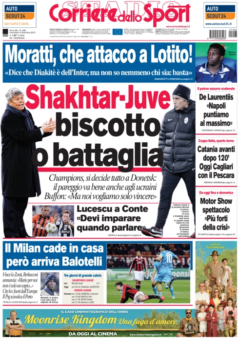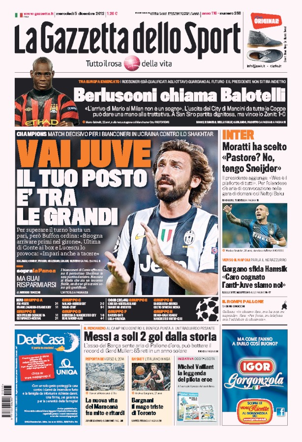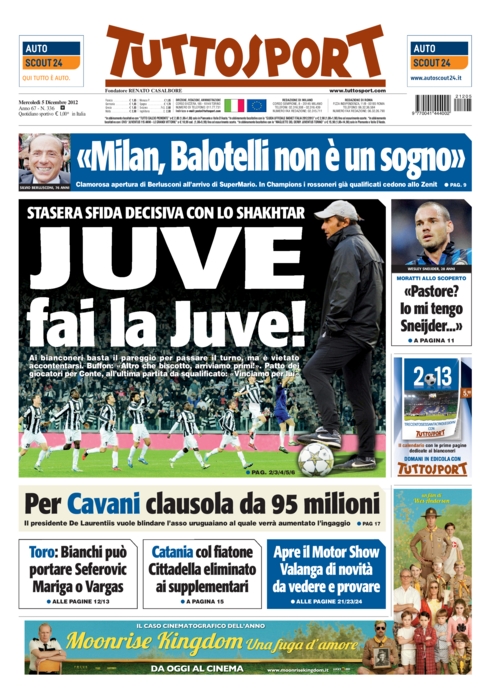 “Juve, fai la Juve”. In sostanza è questo ciò che tutti i giornali italiani chiedono, e che riassume nel suo titolo iniziale Tuttosport. L’orgoglio nazionale dev’essere risollevato dopo che ieri il Milan, già qualificato, ha perso contro lo Zenit. Una sconfitta che fa male solo al morale ma non alla classifica, tanto che solo il Corriere dello Sport dedica a questa notizia un trafiletto.