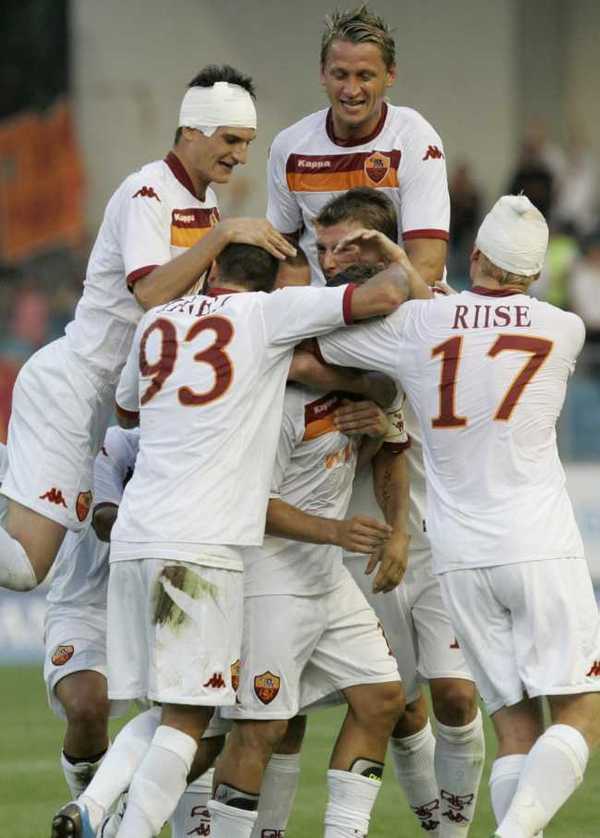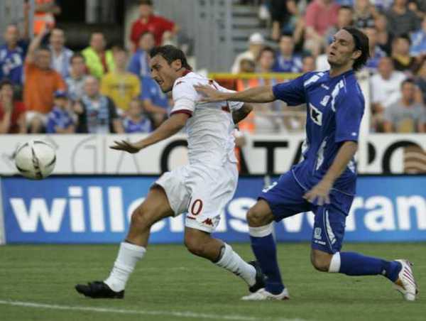 A sbloccare la gara ci ha pensato il solito Totti su calcio di punizione, quando mancava una decina di minuti alla fine della prima frazione di gioco. Poi un fallo di mano in area giallorossa ha provocato un’accesa reazione da parte della tifoseria belga che si è esibita nel lancio di oggetti vari sul rettangolo verde, tanto che l’arbitro stava per sospendere l’incontro. Tornata la calma, la Roma (in superiorità numerica per l’espulsione di Suler) ha affondato i colpi, segnando altre sei reti dal 12′ al 40′ del secondo tempo (Totti, De Rossi, Totti su rigore, De Rossi, Menez, Okaka), mentre i belgi dovevano accontentarsi del gol della bandiera di Smolders.
