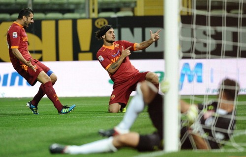 I gialloblu strappavano applausi in diverse occasioni, ma era la Roma a mostrarsi cinica al minuto numero 50′, quando Rosi imbeccava Osvaldo, permettendogli di siglare la sua seconda rete stagionale. Colomba provava a mischiare le carte, inserendo Jadid e Crespo (poi uscito per infortunio) ed il Parma si avvicinava pericolosamente alla porta avversaria. Ma la rete del pareggio non arrivava, per la felicità dei giallorossi che possono festeggiare la prima vittoria in campionato.
