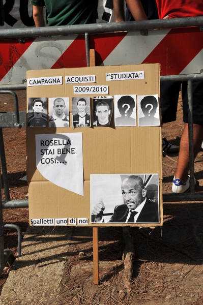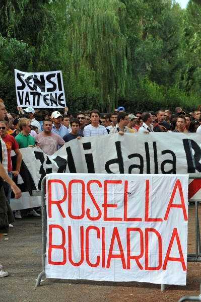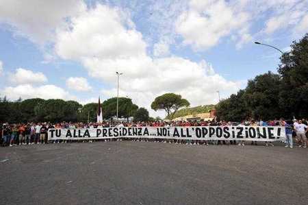 Cori, insulti, fischi striscioni dai toni duri (“Tu alla Presidenza, noi all’opposizione”, “Ora basta”,”Rosella Vattene”, “Rosella Buciarda”,“Sei così incapace che con 1,1 milioni di euro al mese non ci mangi”,”Rosella Sensi bla bla bla” e “Se Rosella se ne va Alleluja”), il clima era davvero rovente intorno alla squadra, che tentava di allenarsi all’interno del Fulvio Bernardini agli ordini di Ranieri. E ad aggravare ancor più la situazione c’è stato il lancio di quattro bombe carta e l’accensione di alcuni fumogeni. Ora la situazione è tornata alla normalità, ma non si prospetta di certo una stagione facile per la società capitolina. A voi la gallery della turbolenta mattinata.