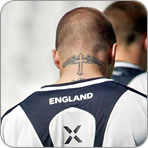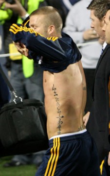L’ultimo tatuaggio, in ordine di tempo, se l’è fatto stampare lungo tutto il fianco sinistro. E’ una frase in cinese che dice: “La vita e la morte sono certi, la ricchezza e l’onore dipendono da Dio“. Evidentemente nella seconda patria del cattolicesimo dopo l’Italia, Beckham ha avuto una crisi mistica, e si è dato alla religione. La cosa che sorprende e non vedere tatuaggi sulle gambe, ma visti i miliardi che gli piovono dagli Usa, possiamo solo aspettare che arrivino.