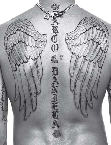 Per concludere i tatuaggi “familiari”, lungo tutta la schiena compare la scritta “Marco e Daniela” in verticale, intervallato da fiori. Ai due lati della scritta compaiono due ali, segno dell’amore che fa volare.